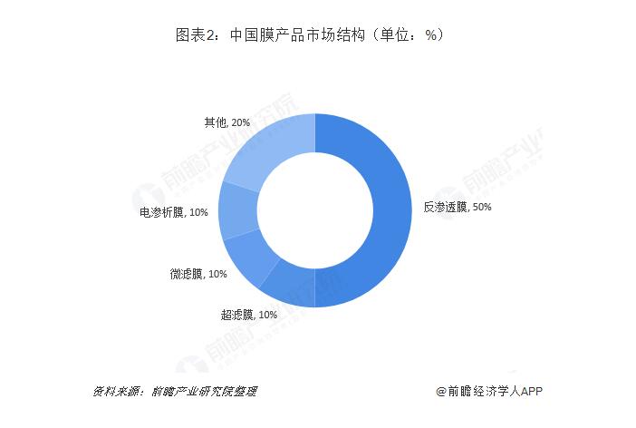 在特定產品方面,膜,總銷售額的50%以上的市場被反滲透膜(RO)和納濾膜(NF)、超濾膜(超濾),微濾膜(MF)和電滲析膜分別占10%,剩下的20%是被氣體分離膜、無機陶瓷膜、滲透膜等類型。